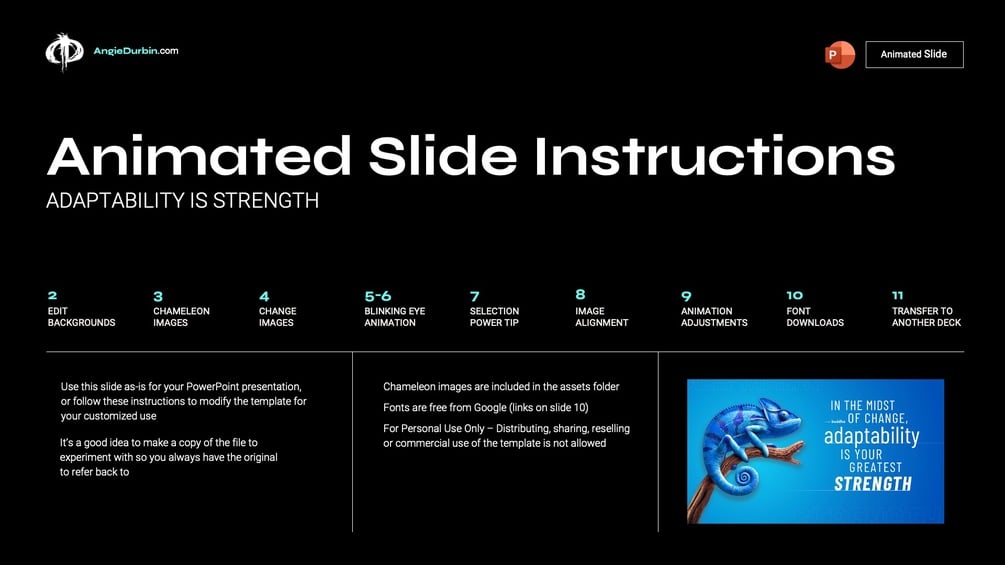 Native PowerPoint 365 file, 11 pages of step-by-step Instructions, links to free Google fonts, Chameleon images included
